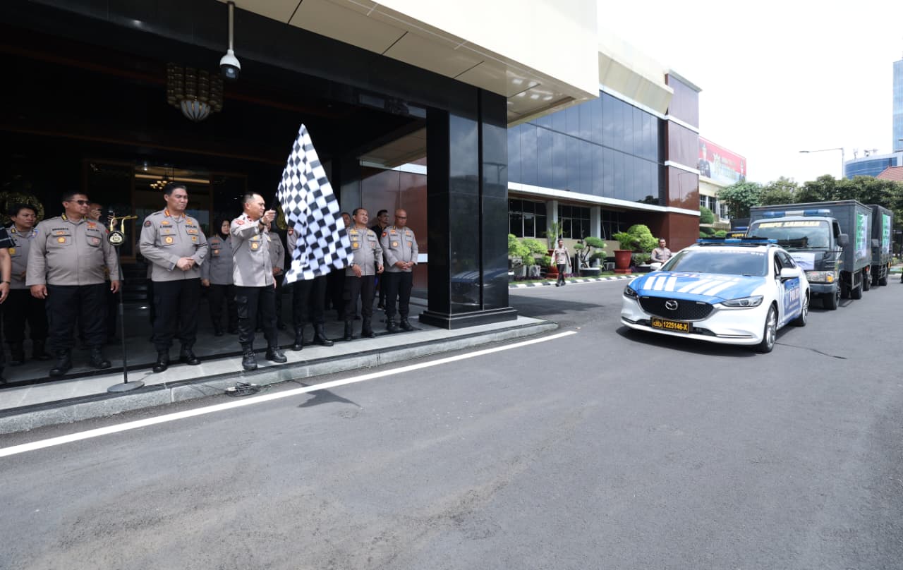 Pelepasan bantuan dipimpin langsung Wakapolda Jatim Brigjen Pol Dr. Pasma Royce, S.I.K., M.H., bersama Pejabat Utama Polda Jatim di depan Gedung Tribrata Mapolda Jatim, Jumat (21/11/2025).