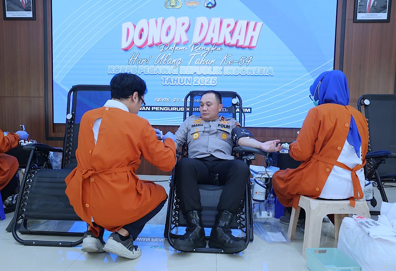 SURABAYA – Menyongsong Hari Ulang Tahun ke-54 Korps Pegawai Republik Indonesia (Korpri), Polda Jawa Timur menggelar kegiatan donor darah di Aula Gedung Bhayangkari, Senin (24/11/2025).