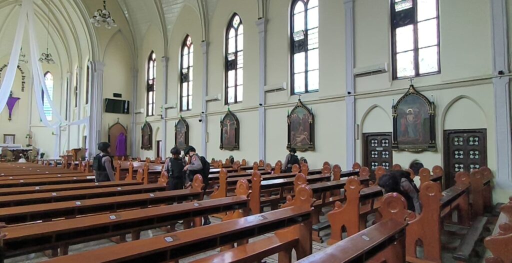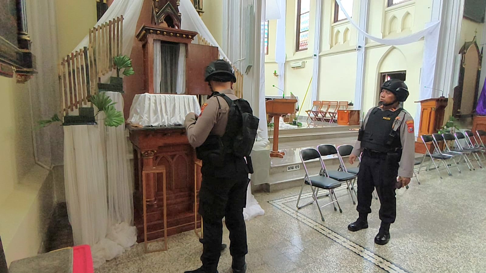 Personel Satsamapta bersama Unit K-9 menyisir seluruh area gereja, mulai dari ruang ibadah, altar, hingga area parkir.